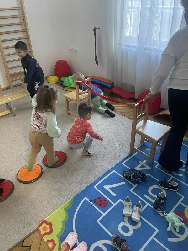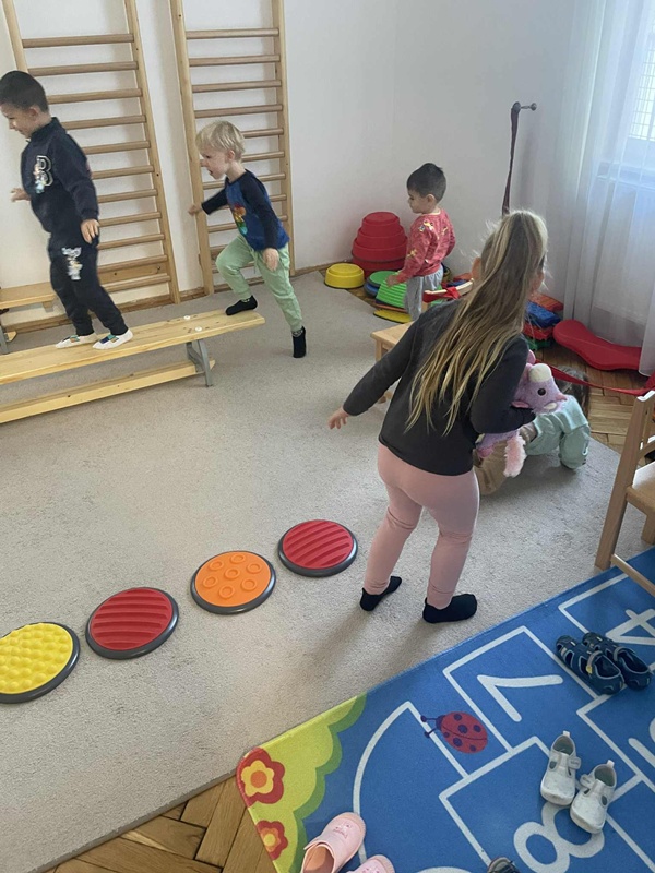 A tornaszoba, a széles folyosó és a megfelelően kialakított udvar a mozgásfejlesztés számtalan formájának kiaknázását teszik lehetővé.
